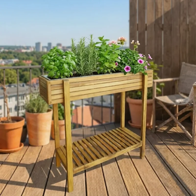Drømmer du om at skabe et grønt åndehul på altanen, terrassen eller i haven? Denne forhøjede plantekasse i akacietræ og zink er det ideelle valg til dig, der ønsker både æstetik og holdbarhed. Med sit rustikke udtryk og gennemtænkte design passer den perfekt ind i moderne såvel som klassiske udendørs miljøer – og er særligt velegnet til altaner, hvor plads og komfort er i fokus.